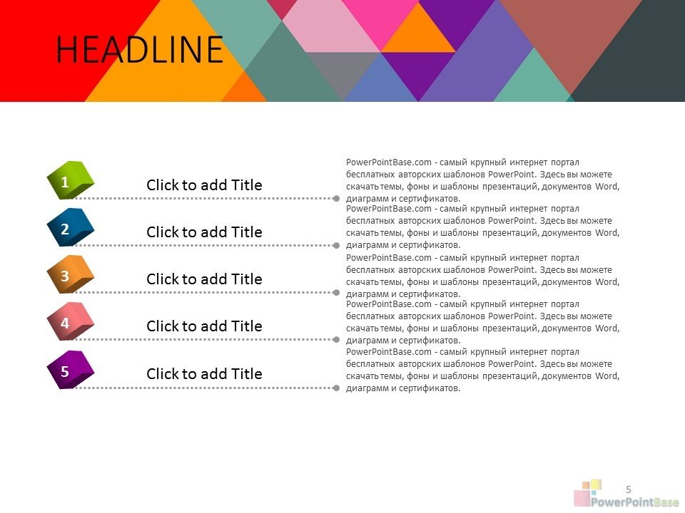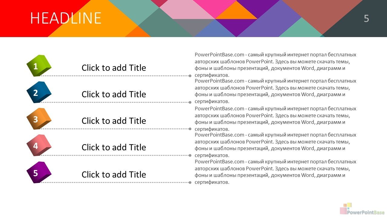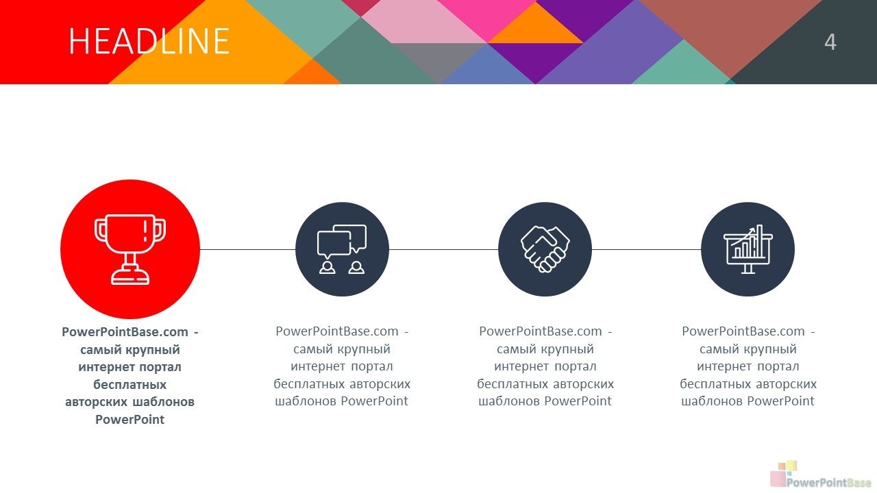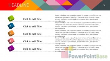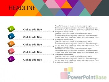 Яркий шаблон презентации PowerPoint. Эффект многослойности создается за счет большого колличетсва элементов разной формы и цвета. В шаблоне присутсвует много разных цветов, поэтому он удачно подойдет под любую тематику. Все элементы шаблона также легко изменяемы и настраиваемы. В стоимость входит шаблон презентации в двух размерах: широкоформатном (16 х 9) и классическом (4 х 3).