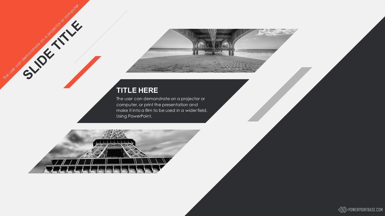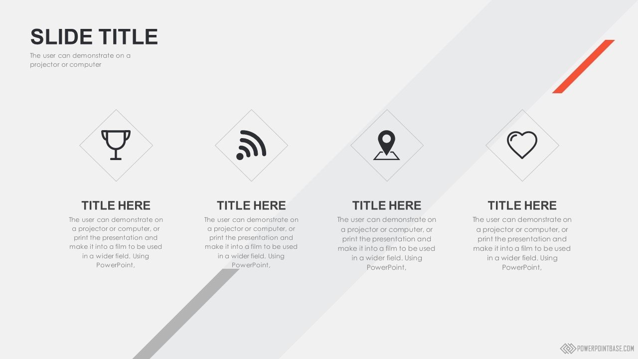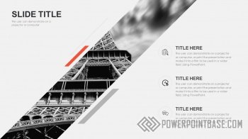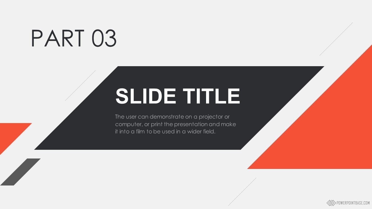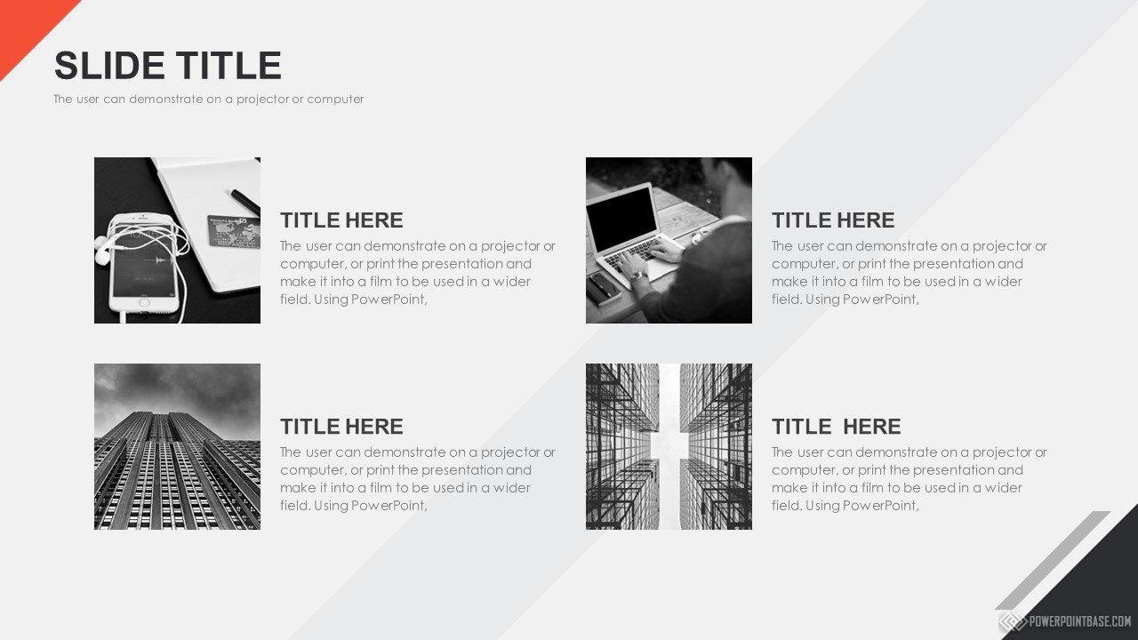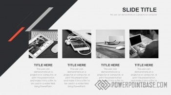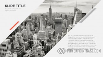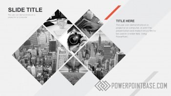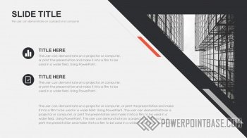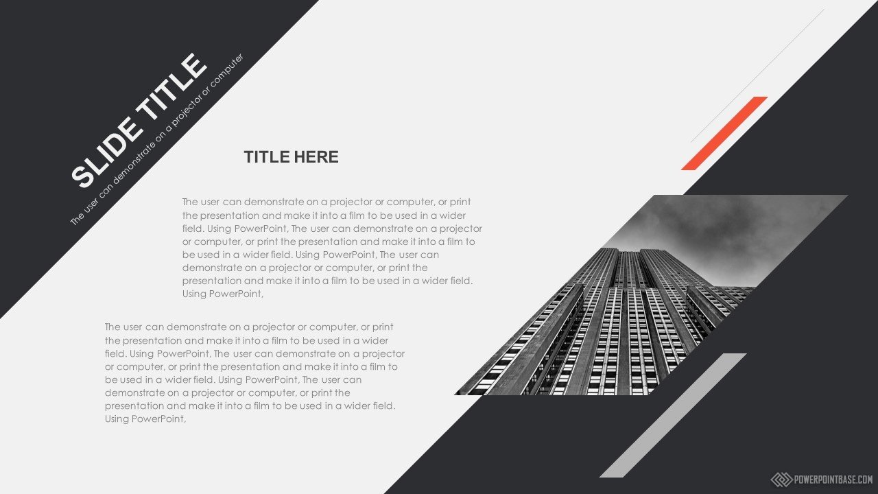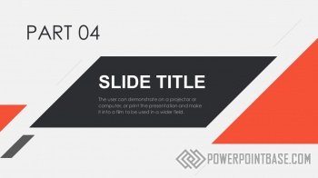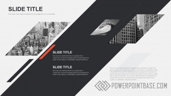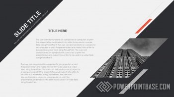 Современный стильный шаблон с использованием наклоненных четырехугольников в качестве основных фигур. В шаблоне используются три основных цвета: серый, черный и красный. Вместе они отлично сочетаются. Слайды достаточно контрастные, а значит могут быть показаны на проекторе.