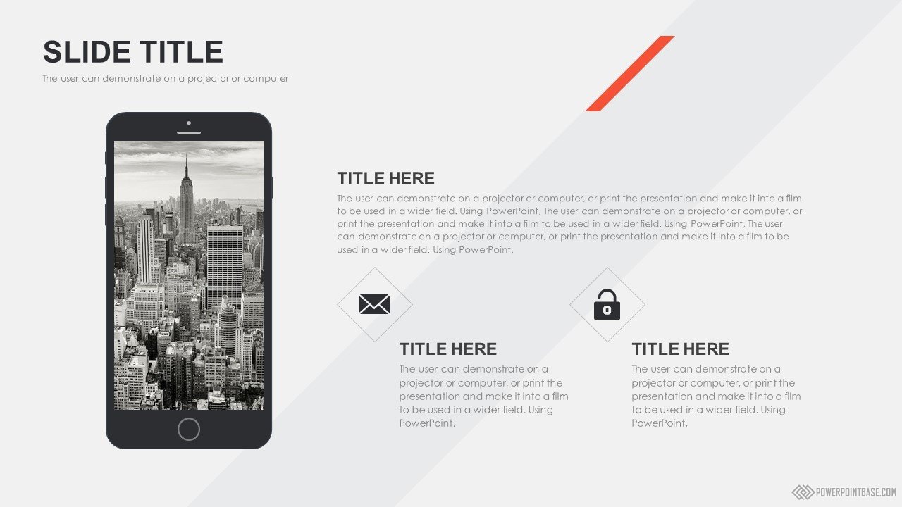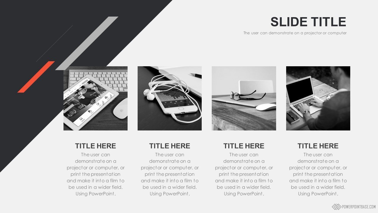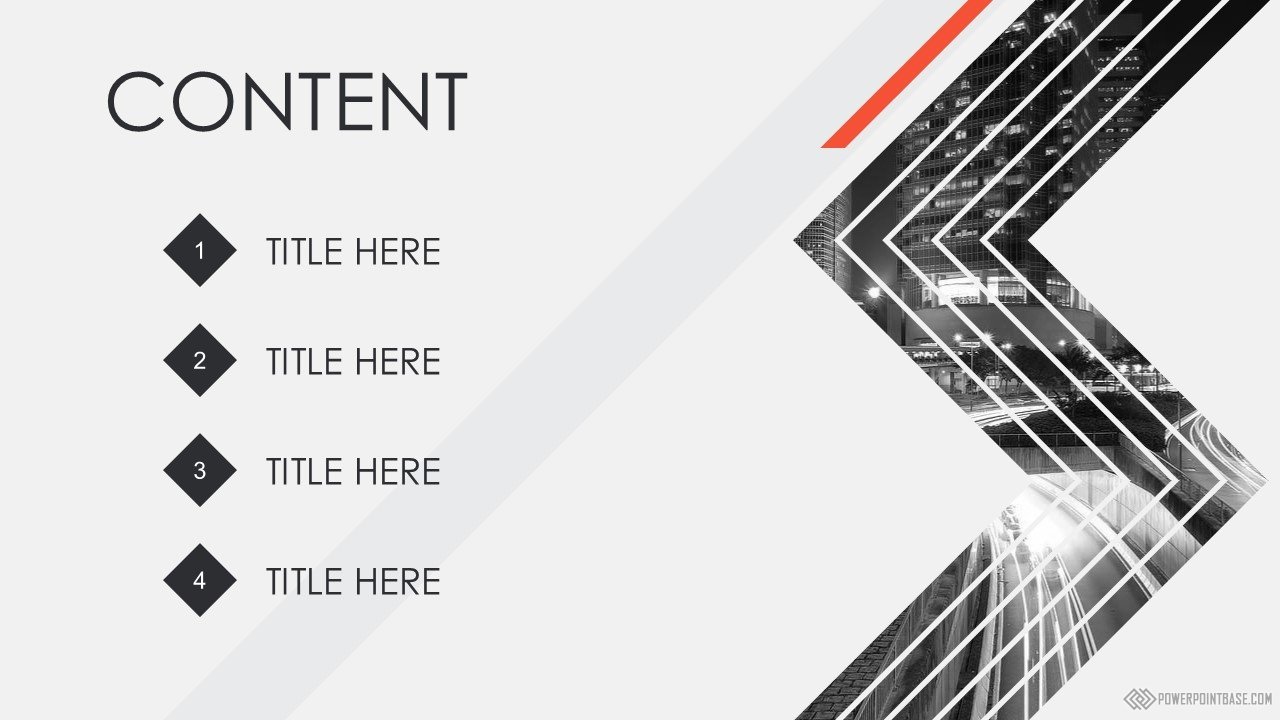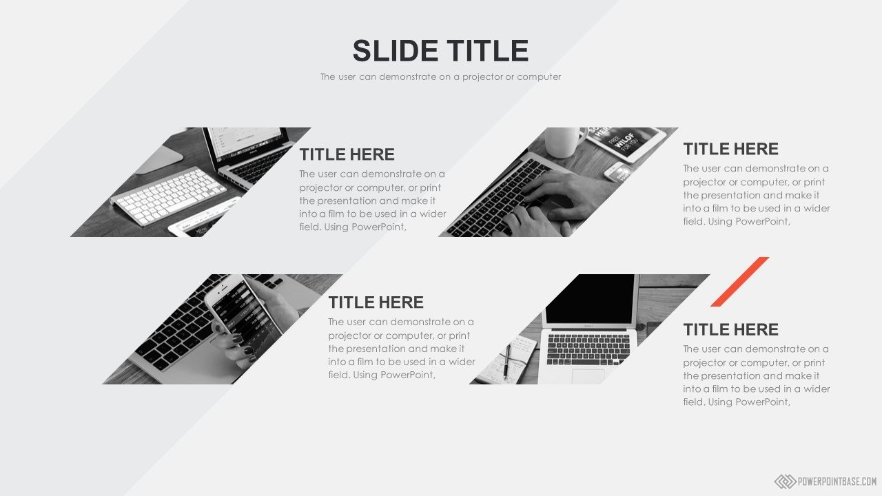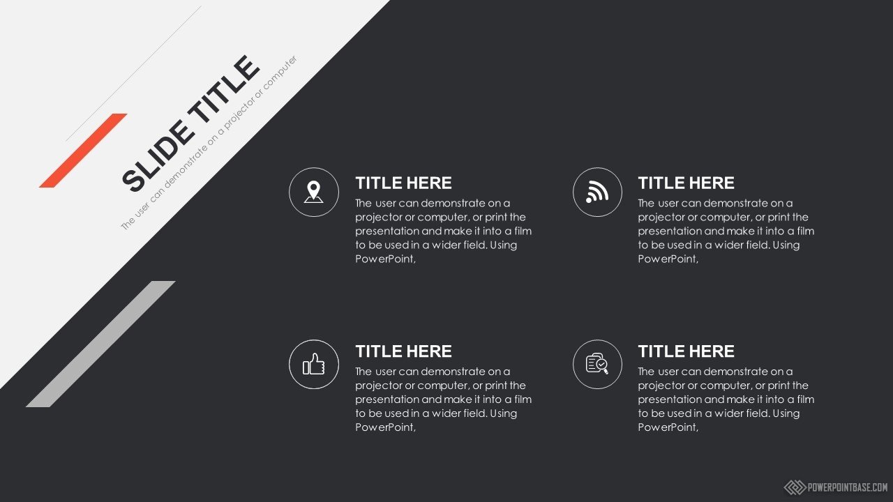 Современный стильный шаблон с использованием наклоненных четырехугольников в качестве основных фигур. В шаблоне используются три основных цвета: серый, черный и красный. Вместе они отлично сочетаются. Слайды достаточно контрастные, а значит могут быть показаны на проекторе.