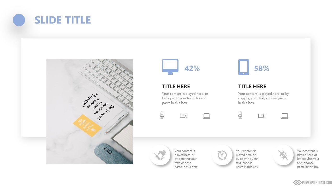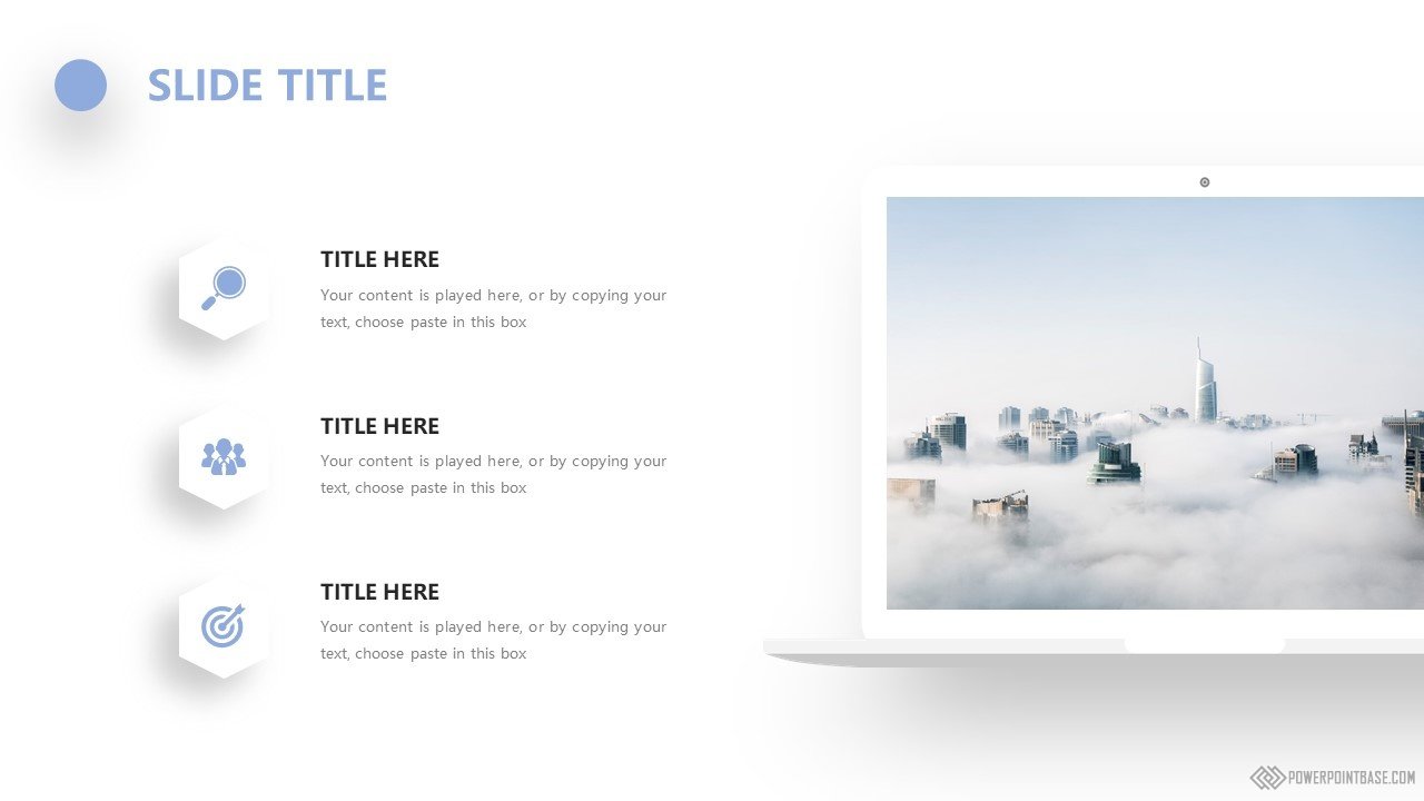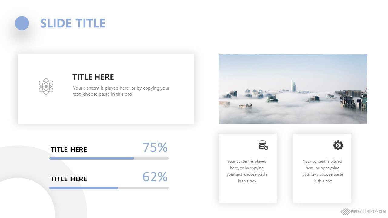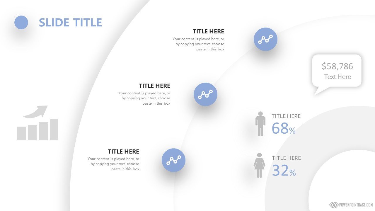 В данном шаблоне основной элемент - круг. Он присутствует на всех слайдах в разных проявлениях. Используются пастельные оттенки синего, что позволит зрителям максимально сконцентрироваться на информации. Все элементы редактируемые. Также на слайдах уже настроена анимация объектов и переходы.